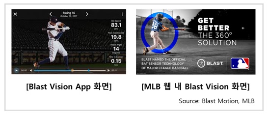 Blast Motion은 야구, 골프, 소프트볼 등 스윙(Swing) 기반의 스포츠를 대상으로 데이터 산출 및 영상 분석 솔루션(Blast Vision)을 개발한 미국 Sports-Tech 스타트업 입니다. 훈련 중 선수들이 Blast Vision센서가 장착된 배트를 사용 시, 배트의 스피드, 임팩트 타이밍, 스윙 각도 등 수치화된 스윙 데이터가 Blast Vision의 스마트폰 앱에 기록 됩니다. 또한, 스윙 장면을 3D 이미지 영상화하는 기술을 통해 선수의 스윙 움직임을 3D이미지 영상으로 확인 할 수 있습니다. 즉, Blast Vision 앱을 통해 선수들은 데이터와 영상 분석 중심의 훈련이 가능하게 되었습니다.