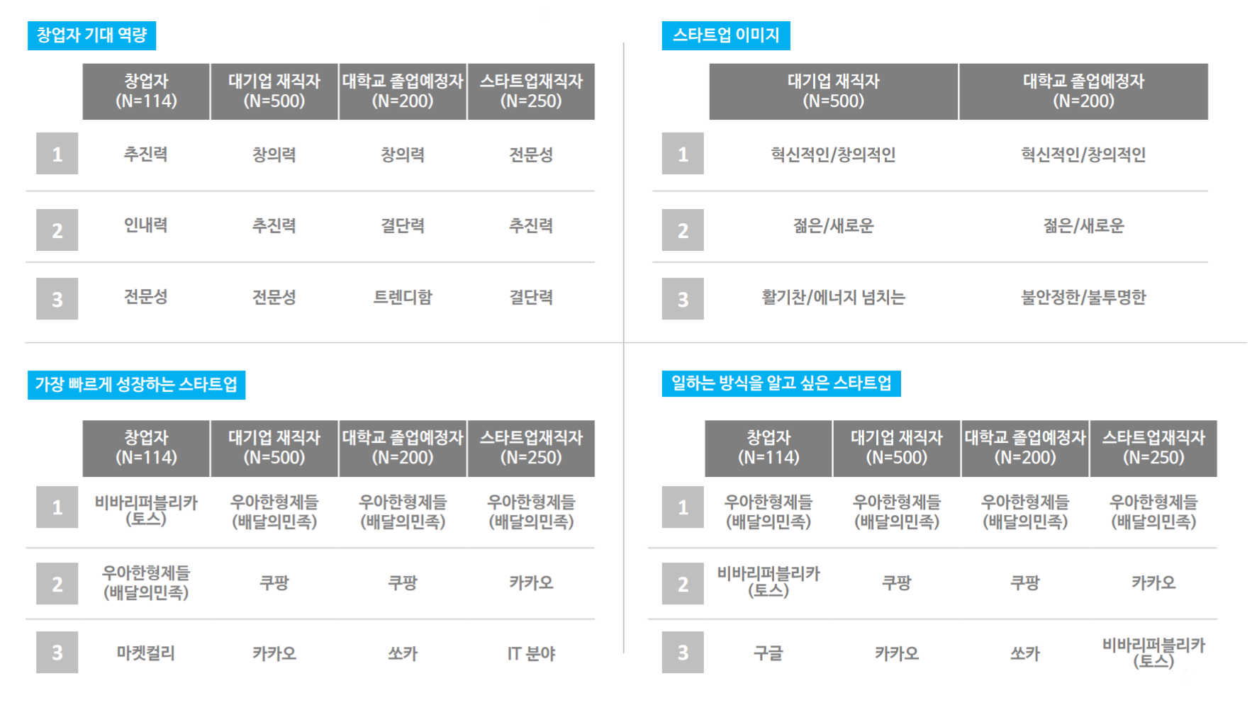 가장 빠르게 성장하는 스타트업에 대해서는 대기업 재직자, 대학교 졸업 예정자, 스타트업 재직자 집단은 모두 배달의 민족(우아한형제들)을 1순위로, 창업자 집단은 토스(비바리퍼블리카)를 1순위로 꼽았다. 한편 일하는 방식을 알고싶은 스타트업으로는 네 집단 모두 배달의 민족(우아한형제들)을 꼽았다.