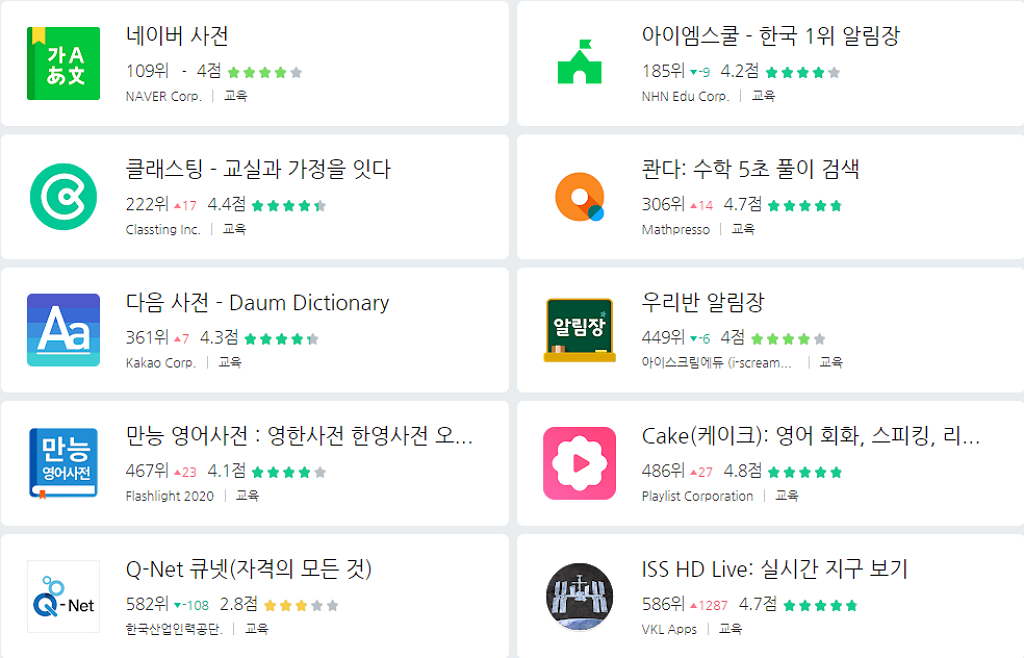 -실사용순위: 네이버 사전 109위, 아이엠스쿨 185위, 클래스팅 222위, 콴다 306위, 다음 사전 361위, 우리반알림장 449위, 만능 영어사전 467위, Cake(케이크) 486위, Q-Net 큐넷 582위, ISS HD Live 586위