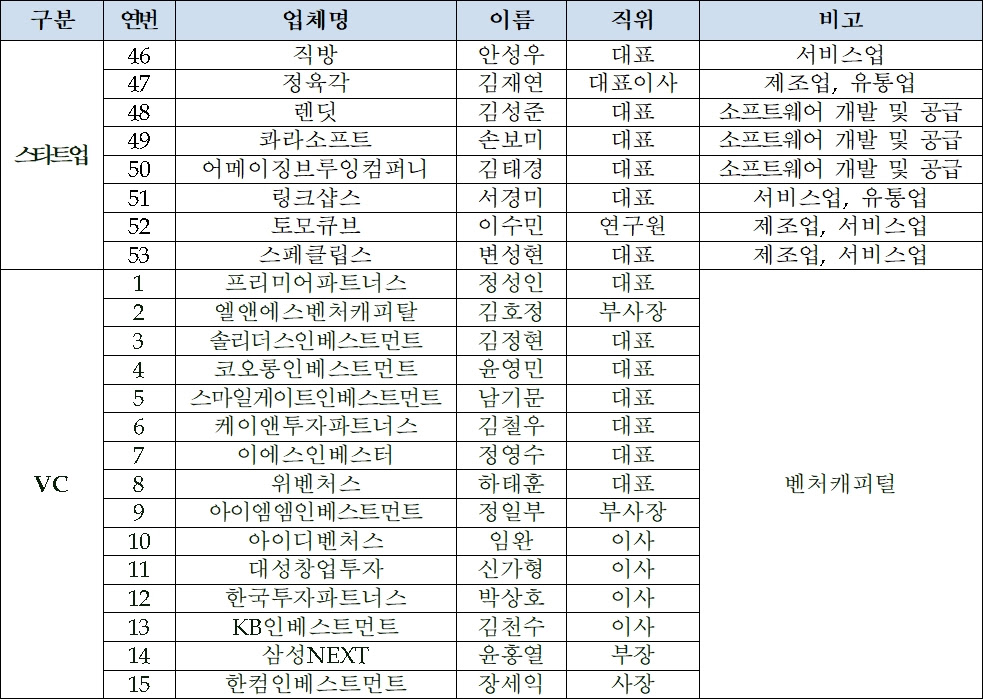 기업규모별로는 스타트업 53개사, 벤처캐피탈·액셀러레이터 25개사, 대중소기업 13개사, 기관·단체 11개사 등으로 구성됐다. 스타트업 중심으로 사절단이 꾸려진 것은 이번이 처음이다.
