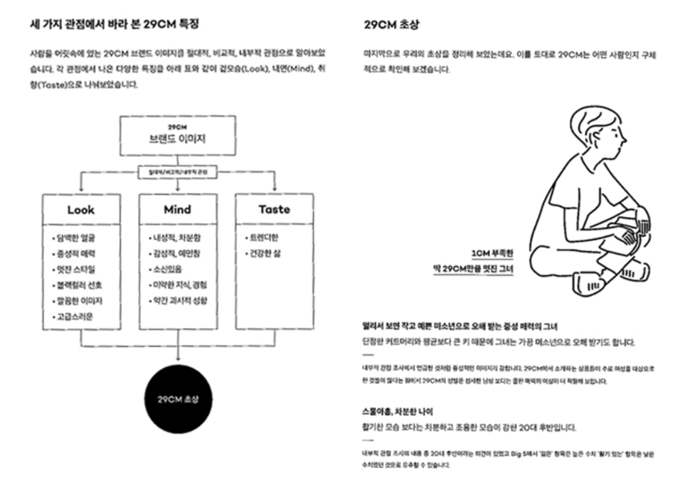 실제로 브랜딩 스토리를 서비스에 녹이는 일은 굉장히 어렵습니다. 모든 팀원을 한 명씩 만나서 공감대를 만들기도 현실적으로 어렵고요. 가장 중요한 것이 모든 구성원이 브랜드 키워드를 인지하고, 자신이 하는 일에 적용하게 만드는 것인데요. 이를 위해 문서화 작업이 꼭 필요하다고 생각해 29CM에서는 수개월에 걸쳐 ‘브랜드 가이드북’을 만들어 배포해보기도 했어요. ‘29CM를 의인화하면 어떤 사람일까?’, ‘29CM다운 모습은 무엇일까?’ 등 총 네 파트로 이루어져 있는 아주 두꺼운 책이에요. 내부 브랜딩을 위해 만든 자료였지만, 밖으로도 공유되고 입소문이 나면서 오히려 더 큰 외부 브랜딩 효과를 가져왔던 사례입니다.