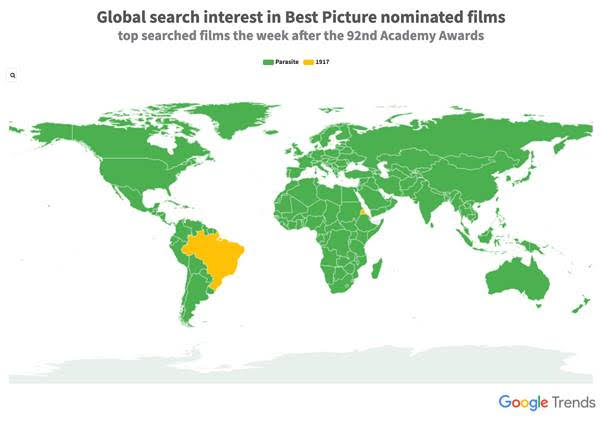 아카데미 시상식 5일 전까지만 해도 기생충은 작품상 후보 중 ‘1917’의 뒤를 이어 전 세계 검색어 순위 2위였다. 싱가포르, 캐나다, 핀란드 등 일부 국가에서만 검색어 순위 1위였다. 하지만 아카데미 작품상을 수상함과 동시에 검색량이 급증했다.