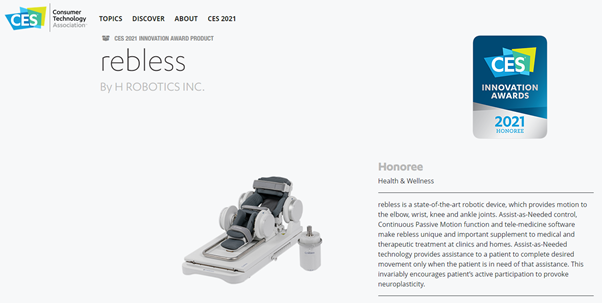 CES 2021의 Heath & Wellness 부문 혁신상을 수상한 에이치로보틱스의 ‘리블레스(Rebless)’는 로봇기술과 IoT 기술이 결합된 스마트 원격재활 솔루션이다. 재활 운동기기와 원격재활 플랫폼이 함께 제공된다는 점이 특징이다. 현재 코로나바이러스 감염증 같은 글로벌 팬더믹 상황 속에서 환자들의 병원 방문이 어려워졌다. 가정에서도 리블레스를 이용하면 전문가의 도움을 받아 효과적인 재활운동을 수행할 수 있어 관련 업계 관계자들로부터 관심을 받고 있다.