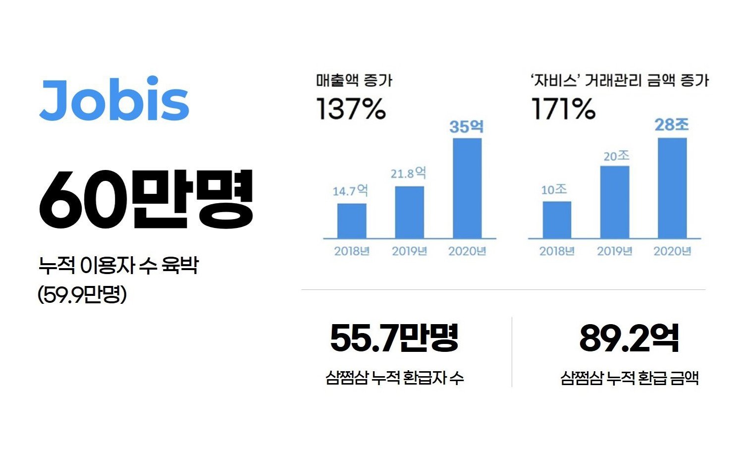 자비스는 기업 대상의 B2B SaaS(기업용 서비스형 소프트웨어) 서비스로 자리잡으며 2020년 말 기준 4만2421개 기업이 공식 플랫폼으로 채택했다. 이는 2018년 1만1758개 대비 260% 이상 성장한 수치다. 또 하나 주목할 점은 거래관리 금액이다. 자비스는 2018년 10조원 규모에 이르던 거래관리 금액이 2020년 기준 무려 28조까지 오르며 171%의 성장세를 기록했다.
