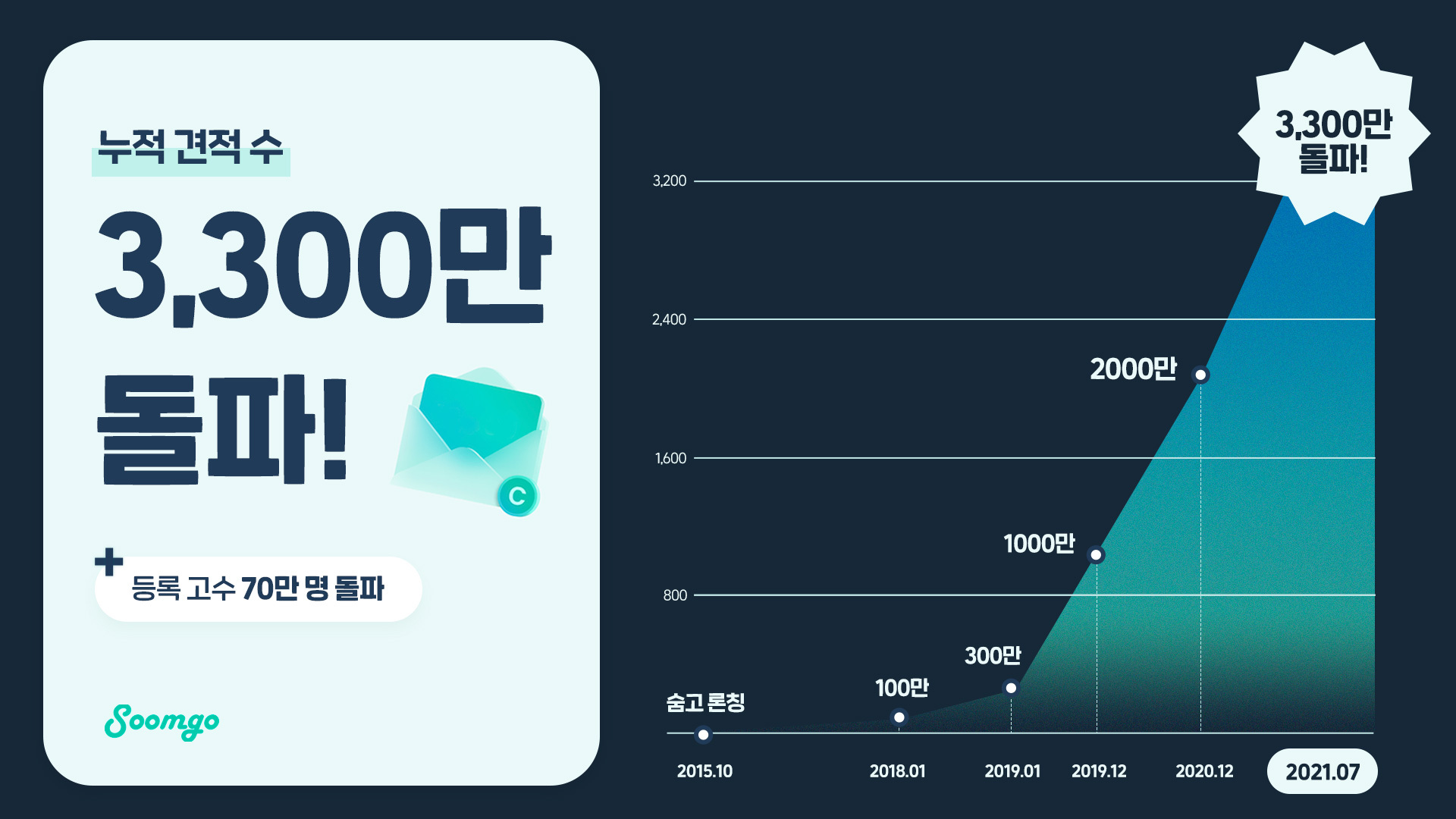 브레이브모바일이 운영하는 매칭 플랫폼, 숨고의 누적 견적서 수가 3천3백만 건을 넘어섰다. 현재까지 숨고에 등록된 고수 수는 약 70만 명이다.