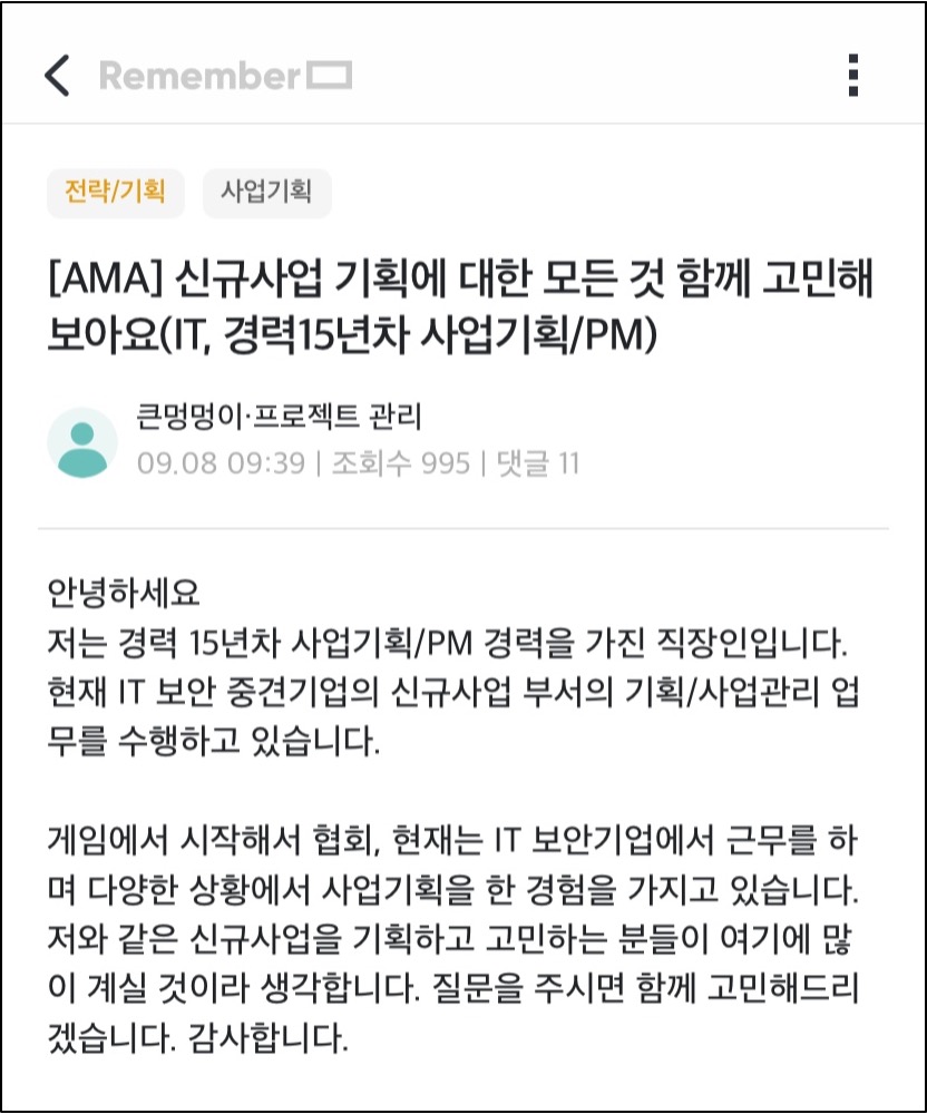 리멤버 전략/기획 커뮤니티 큰멍멍이 님의 AMA 전체보기 >