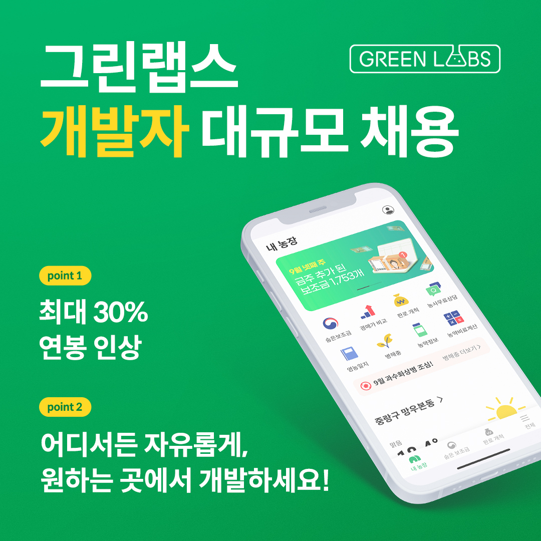 데이터농업 스타트업 그린랩스가 개발자 채용 확대를 위해 최대 30% 연봉 인상, 하이브리드 워크제 도입 등 개발자 보상정책을 강화한다.