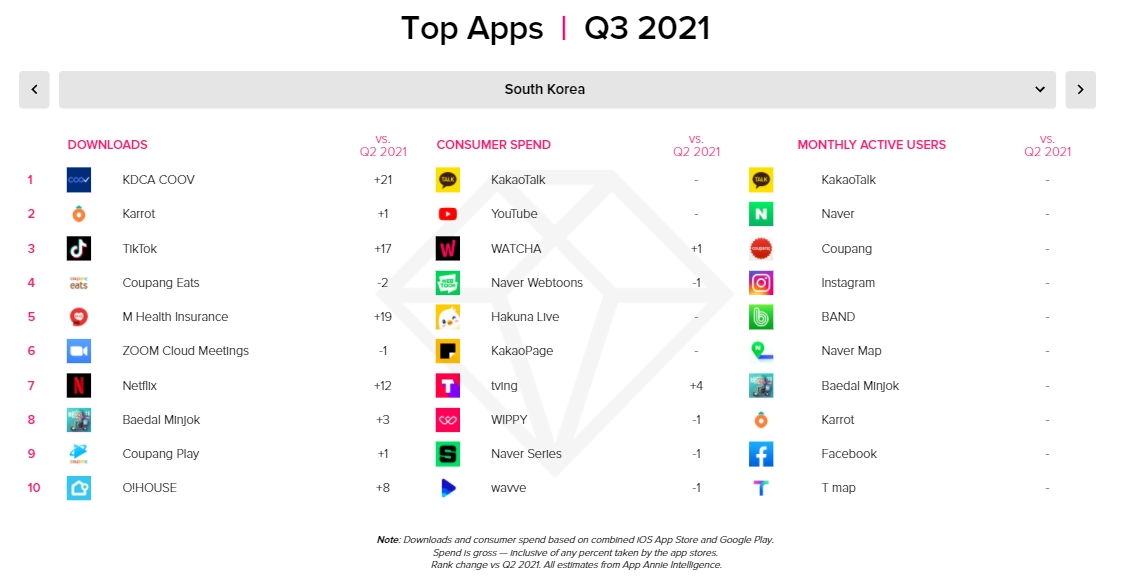 이번 3분기 한국에서 가장 많은 다운로드를 기록한 앱은 질병관리청의 ‘COOV’로, 위드 코로나 시대가 열리고 있음을 확인시켜줬다. 다운로드 2위는 ‘당근마켓’이 차지했는데, 이는 재택근무 등 집에서 보내는 시간이 늘어나면서 집 인근에서 거래하는 사용자들의 니즈가 반영된 것으로 분석된다.