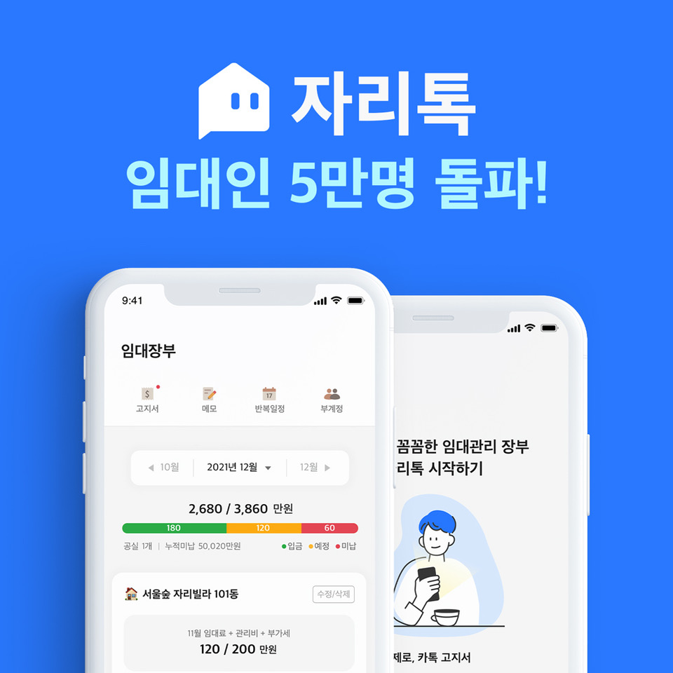 임대관리 앱 자리톡이 론칭 1년 만에 누적 가입 임대인 5만명을 넘어섰다.