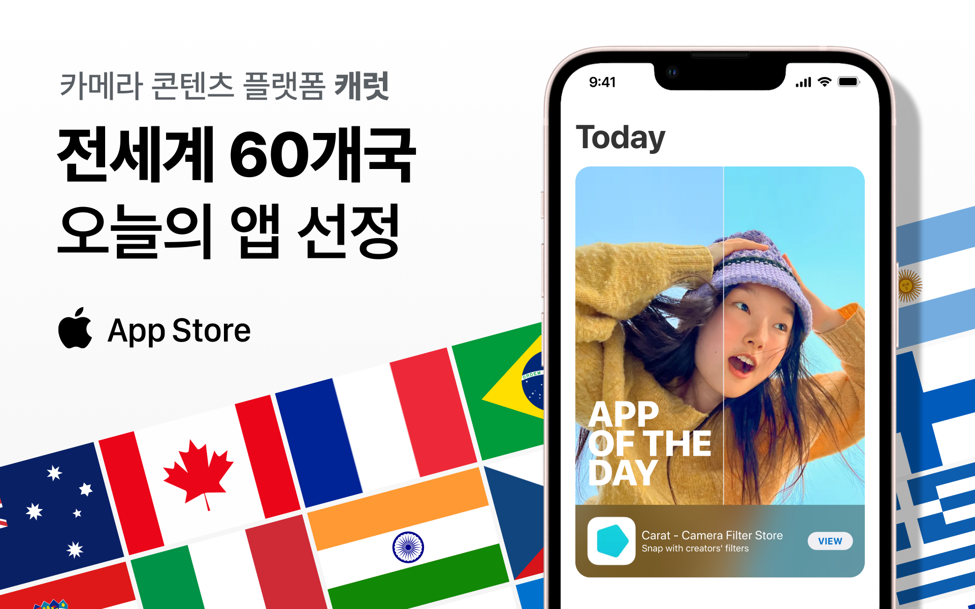카메라 콘텐츠 플랫폼 ‘캐럿’이 글로벌 애플 앱스토어 ‘오늘의 앱’에 선정됐다. 이번 오늘의 앱은 캐나다, 브라질, 프랑스, 인도 등 전 세계 60개국에 동시 선정됐다.