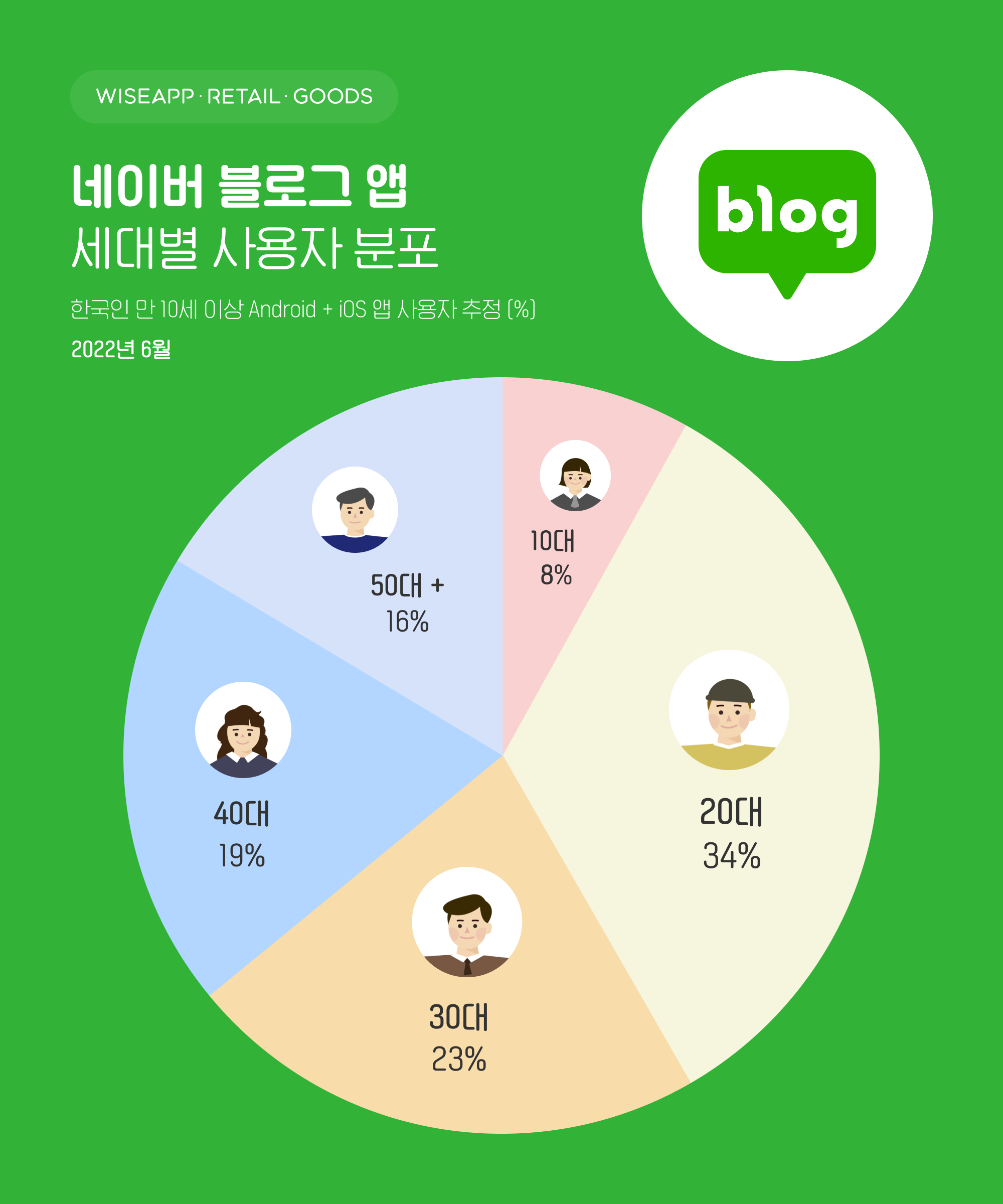 네이버 블로그 앱 사용자 316만 명 중 10대가 8%, 20대 34%, 30대 23%, 40대 19%, 50대 이상 16%로 20대가 네이버 블로그 앱을 가장 많이 이용했다.