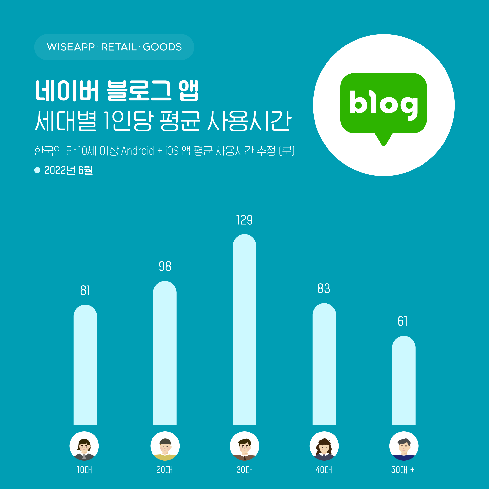 네이버 블로그 앱 총 사용시간 3억 분 중 10대가 7%, 20대 35%, 30대 31%, 40대 17%, 50대 이상 10%로 20대가 네이버 블로그 앱 총 사용시간이 가장 길었다. 사용자수, 총 사용시간 모두 20대에서 가장 높았다.