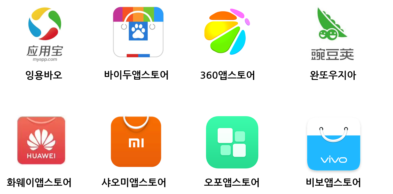 중국 안드로이드폰 시장은 구글 플레이스토어가 막혀있어 대부분 서드파티 앱마켓을 이용한다. 대표적인 서드파티 마켓으로 텐센트, 바이두, 360 등 인터넷 기업이 제공하는 서비스와 화웨이, 샤오미, 오포, 비보 등 스마트폰 제조사의 서비스가 있다.