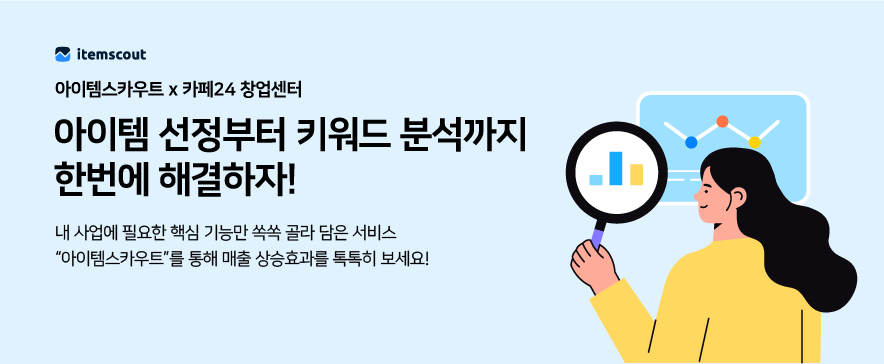 아이템스카우트가 전자상거래 특화 비즈니스센터인 카페24 창업센터 입주자를 대상으로 자사 서비스 ‘아이템스카우트’의 데이터를 무료 제공한다. 카페 24 창업센터 입주자는 아이템스카우트의 서비스를 통해 비즈니스 성장을 보다 데이터적인 관점으로 실질적인 매출 신장과 수익성 강화의 기회를 얻게 됐다.