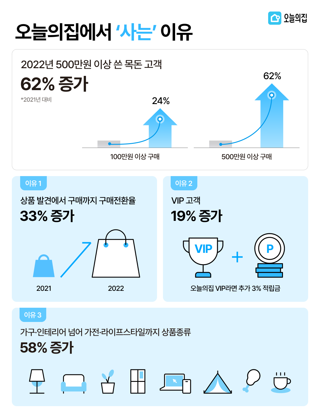 2022년 오늘의집 고객 가운데 100만 원 이상 지출한 고객은 전년 대비 24% 늘어났다. 이사, 인테리어, 신학기 가구 구매 등 연 1회 목돈을 지출하는 고객이 많은 오늘의집의 특성을 고려할 때 고객들은 한번에 목돈을 사용하는 ‘신뢰할 수 있는 쇼핑 채널’로 오늘의집을 선택한 것으로 해석된다.