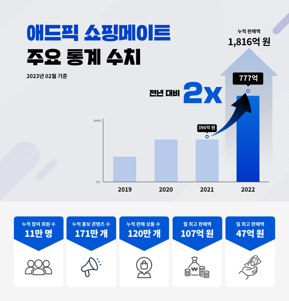 디지털 마케팅 기업 오드엠이 운영하는 인플루언서 플랫폼 ‘애드픽 쇼핑메이트’의 2022년 판매액이 777억 원을 기록, 전년대비 2배 성장했다.