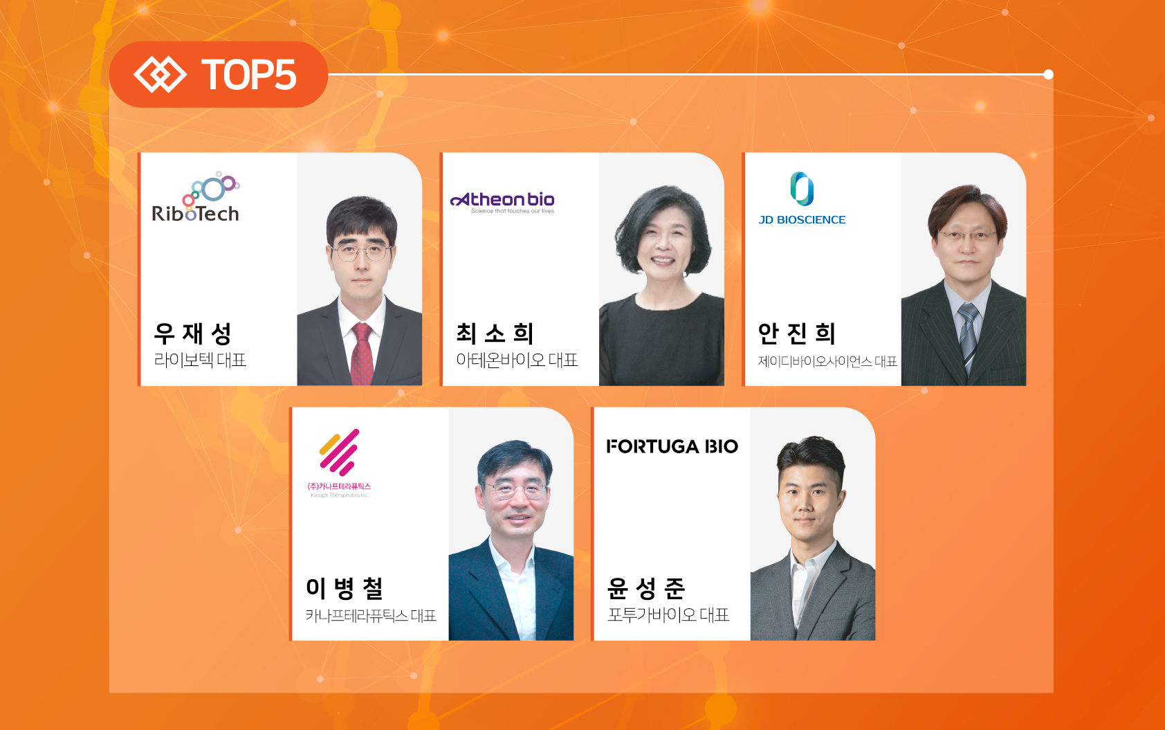 TOP5와 멘토사에는 라이보텍 – 오스코텍, 아테온바이오 – 레고켐바이오사이언스, 제이디바이오사이언스 – 알테오젠, 카나프테라퓨틱스 -레고켐바이오사이언스, 포투가바이오 – 우정바이오가 매칭됐다.
