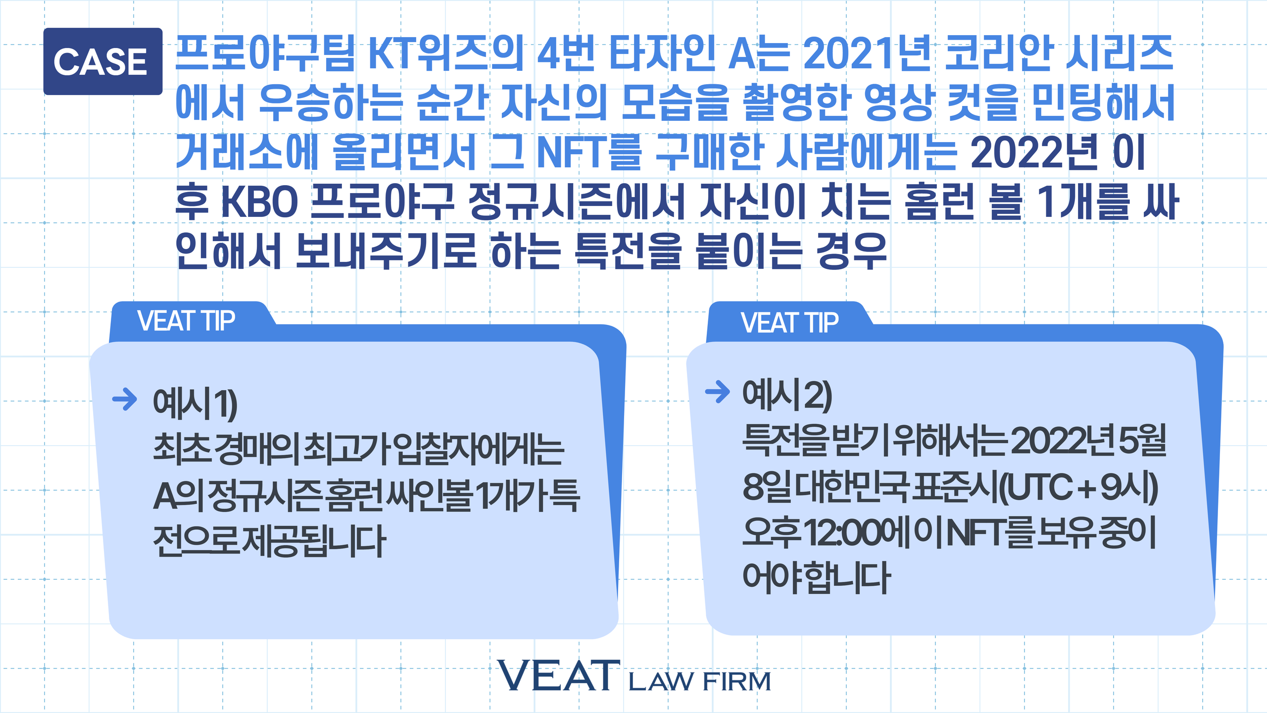 예를 들어서, 프로야구팀 KT위즈의 4번 타자인 A는 2021년 코리안 시리즈에서 우승하는 순간 자신의 모습을 촬영한 영상 컷을 민팅해서 거래소에 올리면서 그 NFT를 구매한 사람에게는 2022년 이후 KBO 프로야구 정규시즌에서 자신이 치는 홈런 볼 1개를 싸인해서 보내주기로 하는 특전을 붙였습니다. 이 NFT는 B에게 판매되었고, A는 특전에서 약속한 대로 B에게 자신의 홈런 볼 한 개를 싸인해서 보내주었습니다. 그런데 그 후 B는 이 NFT를 C에게 전매(재판매)하였습니다. C는 자기에게도 특전에 따라 싸인된 홈런볼을 보내 줄 것을 요구하였습니다. A는 이 요구에 응하여야 할까요?