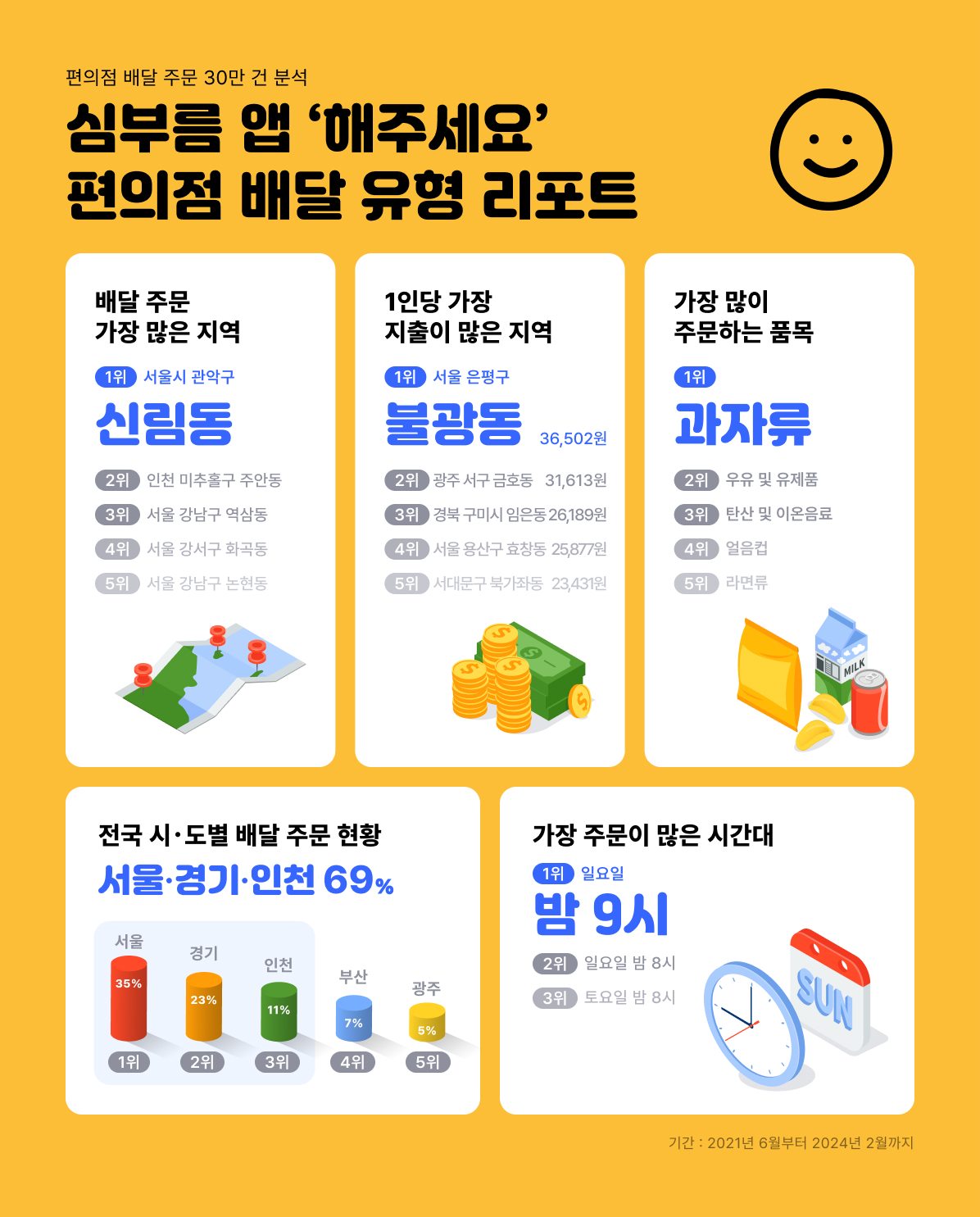 이번 공개한 해주세요 편의점 배달 유형 리포트는 2021년 6월부터 2024년 2월까지, 2년 8개월간 누적된 편의점 배달 주문 30만건을 지역, 시간, 품목별로 분류, 분석했다.