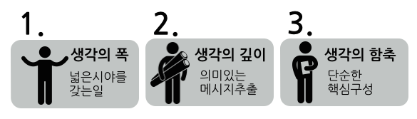 기획자가 가져야 할 세 가지 생각정리 역량 중 가장 중요한 것은 ‘생각의 함축’이다. 이는 전체 논리와 이야기를 매끈하게 한 덩어리로 뽑아내는 일인데 대부분의 기획자가 좋은 원석을 가지고서도 보석을 만드는데 실패하는 가장 큰 이유이다. 반면 가장 파괴력이 큰 역량은 두번째인 ‘생각의 깊이’인데 여기에서 나온 카피와 문구같은 메시지는 실제 내용에 더 임팩트를 부여해 주기에 중요하다. 사람들이 결국 기억하는 것은 두번째에서 뽑아낸 메시지이다. 그에 비해 첫번째인 ‘생각의 폭’은 실체가 가장 모호한 역량이다. 주제를 받았을 때 어떻게 접근할 것인가를 결정하는 것인데 여기엔 뚜렷한 공식이 없기 때문이다. (이는 사실 나머지 둘도 마찬가지지만 가장 실체가 모호한 것이 첫번째 역량이다)