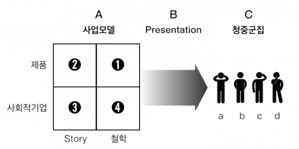 이렇게 청중을 세분화 하는 것은 우리가 마련한 ➊➋➌➍를 서로 다르게 적절히 블랜딩하여 내놓을 것이기 때문이다. 만약 세바시를 통해 대중 강연을 한다면 난 ➋➌의 스토리텔링을 중심으로 ➊➍를 약하게 섞어서 내놓을 것이다. 만약 강연의 성격이 사회적기업이 주라면 ➌과 ➍를 중심으로 ➋➊을 블랜딩할 수 있다. B-to-B 거래에서 따로 설명의 기회가 없는 제안서라면 ➊을 중심으로 블랜딩될 것 같다.
