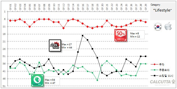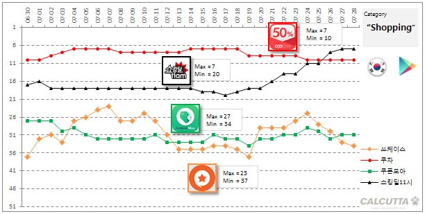 - Android (Google) : 안드로이드마켓에서는 “쿠차”의 인기가 높으나, “쇼킹딜”이 1급등하며 1위에 턱걸이 했으나, 좀더 지켜봐야 합니다.