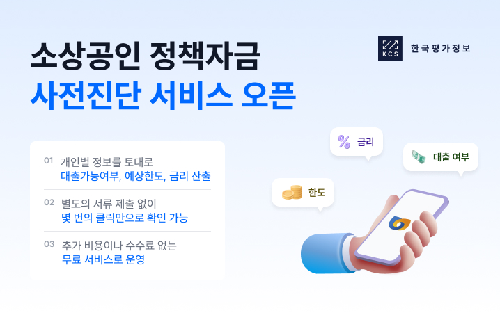 전업 개인사업자 신용평가사인 한국평가정보(KCS)가 소상공인시장진흥공단(소진공)과 협력해 2025년 소상공인 정책자금 사전진단 서비스를 제공한다. 소상공인 정책자금 사전진단은 2023년 이후 소상공인을 위한 데이터 기반 금융 지원 시스템으로 혁신에 앞장서고 있는 대표적인 서비스다.