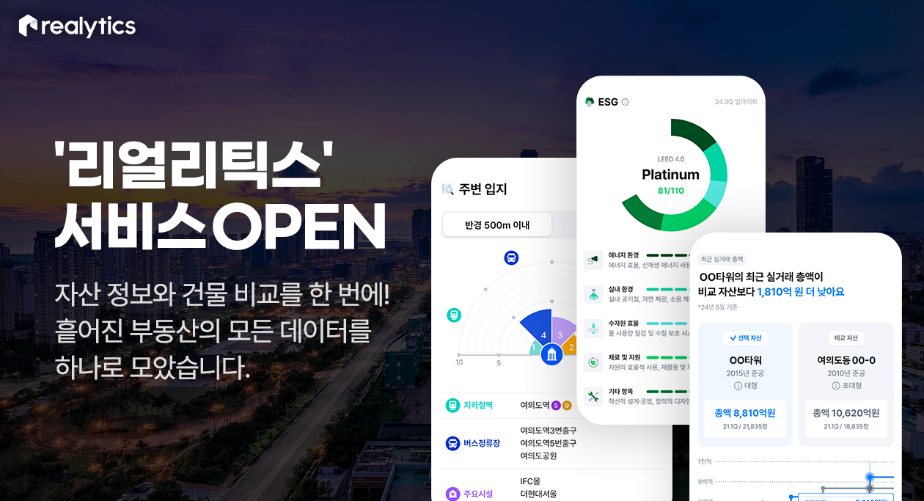 부동산 투자 플랫폼 ‘리얼바이’를 운영하는 파이퍼블릭이 상업용 부동산 데이터 솔루션 ‘리얼리틱스’를 출시했다. 이 새로운 서비스는 상업용 부동산 투자와 관련된 심층 데이터를 제공하여 효율적이고 데이터 중심적인 의사결정을 지원한다고 회사 측은 밝혔다.