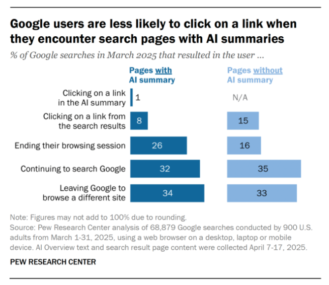 퓨 리서치 센터 연구 결과, AI 오버뷰 표시 시 링크 클릭률 절반으로 급감