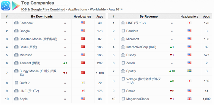 8월 한 달 동안 iOS & 구글플레이의 비(非)게임 분야 통합 다운로드 순위를 조사한 결과 페이스북 메신저가 최다 다운로드 수를 기록하였다. 페이스북이 메신저 기능을 독립적인 페이스북 메신저(Facebook Messenger) 앱 운영하는 전략을 세워, 기존 페이스북 사용자들에게 메신저 앱 설치를 권장하여 서비스를 이전하고 있다.
