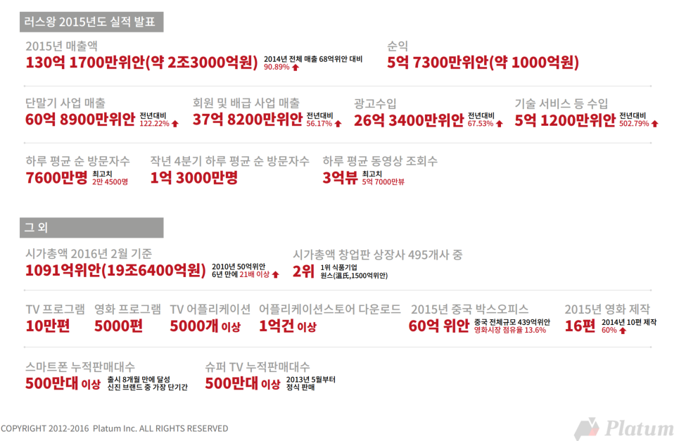 2015년 4분기를 기준으로 사국, 자체제작 웹 드라마 등 양질의 인기프로그램 영향으로 순방문자, 월방송량, 방송 시간 등 4개 항목에서 10개의 인터넷 사이트 중 전부 1위를 차지하기도 했다. 2013년 이후 인터넷 동영상 플랫폼 업체 대다수가 적자로 돌아설 때에도 안정적인 수익원을 유지한 기업이기도 하다. 이에 BAT를 이을 인터넷 산업계의 차기 주자로 급부상하기도 했다.