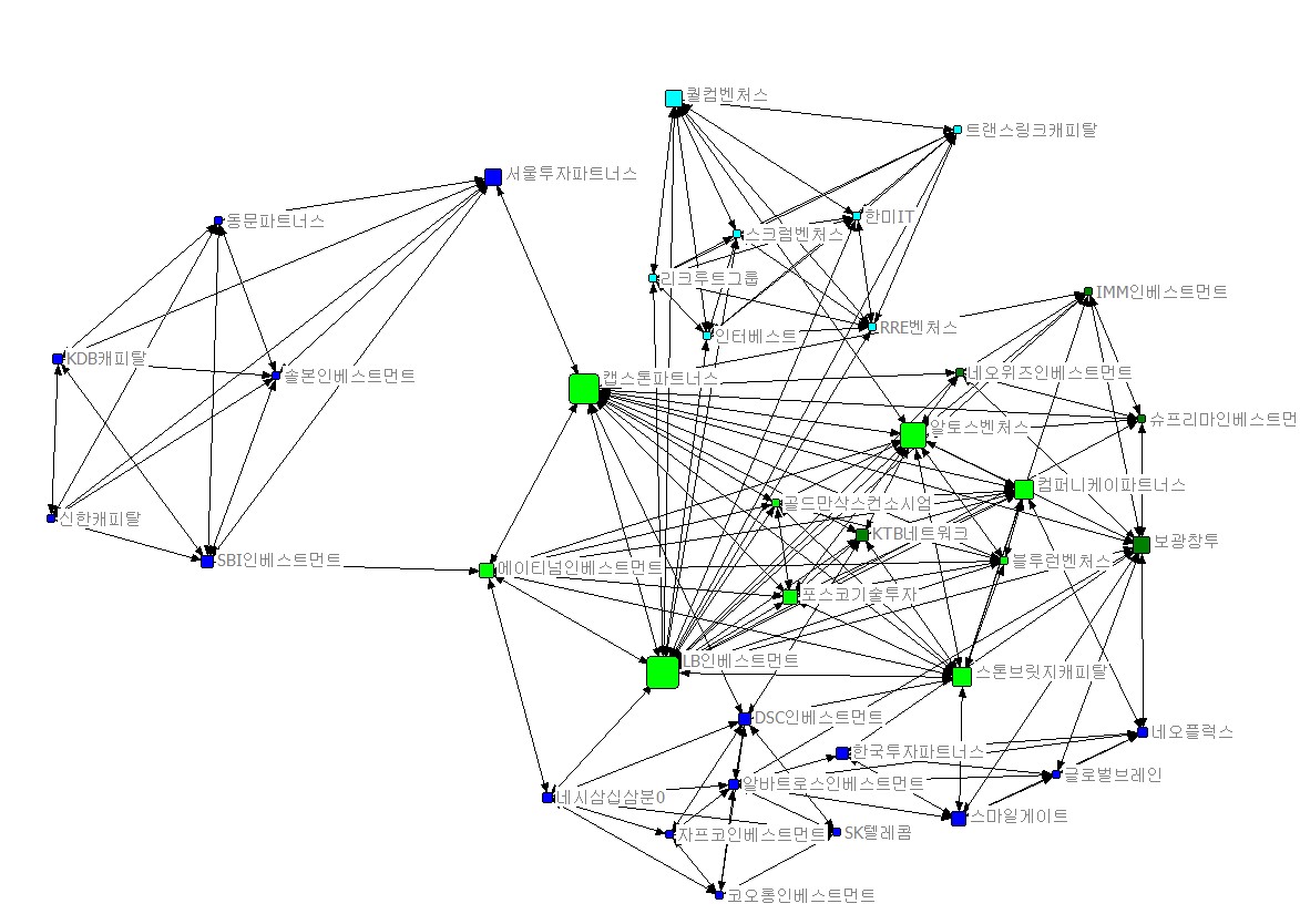 14~15년 투자정보를 바탕으로 투자관계를 한눈에 볼 수 있는 네트워크를 구성해 보았다는 점에서 의의를 두고자 하며 위 분석을 바탕으로 작은 결론을 내려보자면, 스타트업 투자를 주도하는 몇 개의 메이저 투자사들이 존재하며 이들은 공동투자를 진행하거나 서로 정보를 주고받으면서 하나의 그룹으로서 행동한다는 경향이 있는 것을 알 수 있다. 이들 그룹으로부터 투자를 받는 스타트업은 이들의 사회적 인프라를 통해 투자금 이상의 혜택을 받을 것을 기대해볼 수 있다. 또한 투자사들의 성향에 따라 다양한 분야에 투자를 하는 투자사들과 특정분야에 집중하는 투자사들이 존재하며 투자를 계획 중인 스타트업이라면 이러한 성향을 고려해 보는 것이 도움이 될만하다. 많은 투자를 진행하지는 않지만 투자사 네트워크에서 중요한 위치에 있는 (구조적 공백을 활용할 수 있는 여지가 큰) 투자사들과 좋은 관계를 유지함으로써 투자와 관련된 핵심적인 정보에 접근하거나 이들과의 관계를 레버리지로 활용할 수 있는 여지도 존재한다.
