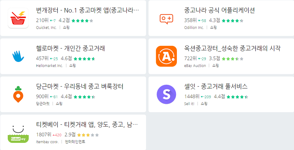 번개장터 210위, 중고나라 358위, 헬로마켓 457위, 옥션중고장터 722위, 당근마켓 900위,셀잇 1448위, 티켓베이 1807위