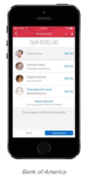 뱅크오브아메리카는 미국 은행 중에서 처음으로 P2P 이체 서비스를 모바일 뱅킹 앱 안에 통합했다. 이 은행은 2017년 2월 고객 디바이스에 있는 연락처를 이용해 계좌 이체를 단순화하는 업데이트를 발표했다. 저녁식사 같은 비용을 친구 여럿이 나눠서 지불할 수 있는 기능도 도입했다. 교체 이체 기능으로 더욱 간편해진 기능이다.