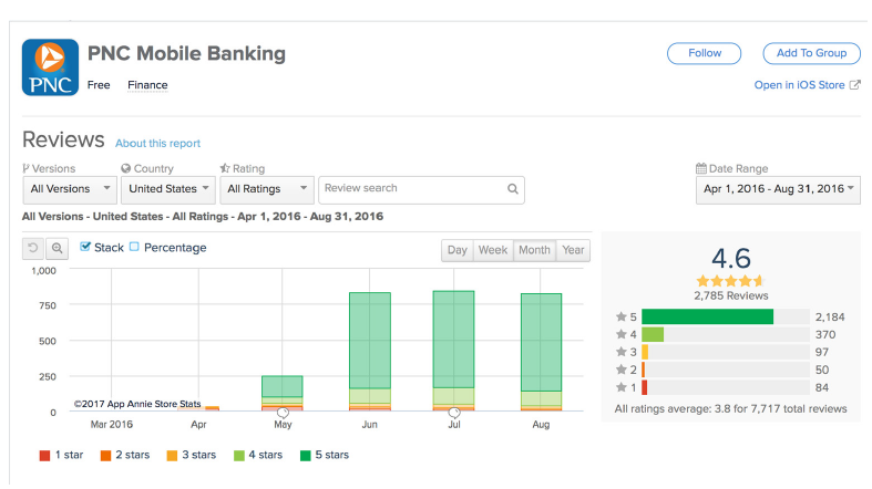 앱의 평가와 리뷰를 모니터링하면서 다른 뱅킹 앱의 새 기능을 확인하고 사용자 경험을 개선하는 것이 필요하다. PNC는 2016년 5월 모바일 예금 기능을 업데이트한 후 긍정적인 리뷰를 받았다. 업데이트 직후 몇 달 동안 앱 평가가 대폭 개선되면서 5점 만점에 평균 4.6점 정도를 기록하고 있다. 사용량 또한 늘어, 2016년 3분기 사용자 일인당 월평균 세션이 전 분기보다 10% 정도 상승했다.