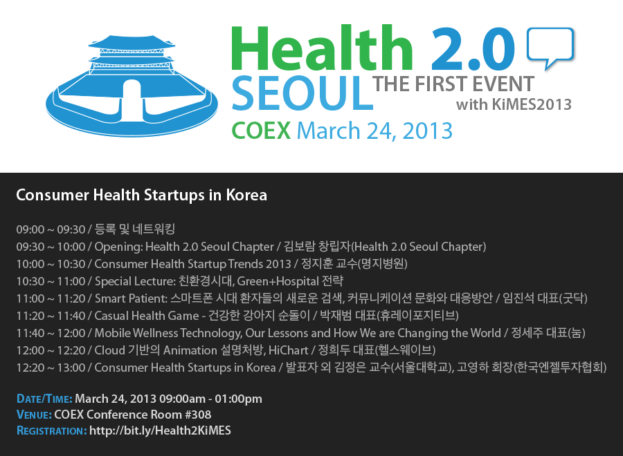 Health 2.0 Seoul Chapter의 첫 번째 행사가 ‘Consumer Health Startups in Korea’라는 주제로 2013년 3월 24일 일요일 오전 9시부터 오후 1시까지 COEX 컨퍼런스룸 308호에서 개최된다.