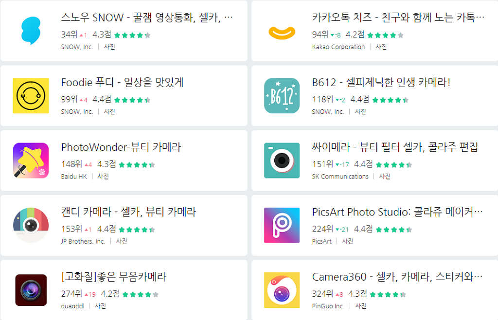 스노우 34위, 카카오톡 치즈 94위, 푸디 99위, B612 118위, PhotoWonder 148위, 싸이메라151위, 캔디 카메라 153위, PicsArt 224위, 좋은 무음카메라 274위, Camera360 324위