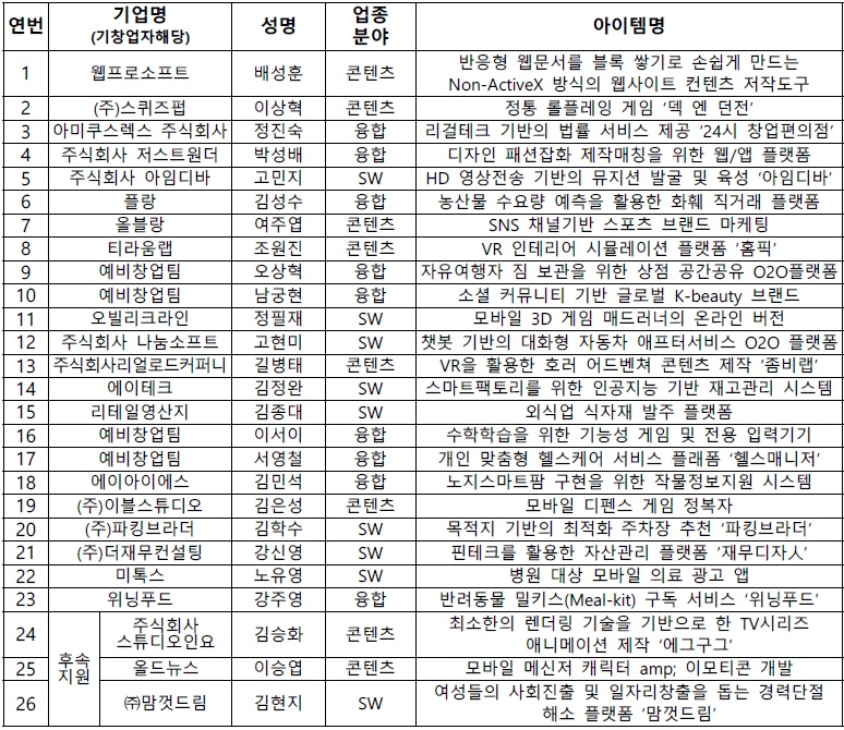 이번 선발과정에는 총 119개팀이 지원한 가운데 한달 간 서류평가와 1, 2차 발표평가를 거쳐 총 23개팀(콘텐츠분야 6개팀, SW분야 8개팀, 융합분야 9개팀)이 5:1의 치열한 경쟁률을 뚫고 신규 선발됐다. 또한 2017년 우수한 성과를 거둔 창업기업 3개사도 함께 후속 지원 대상으로 선정돼 창업 초기 전 단계를 지원받게 된다.