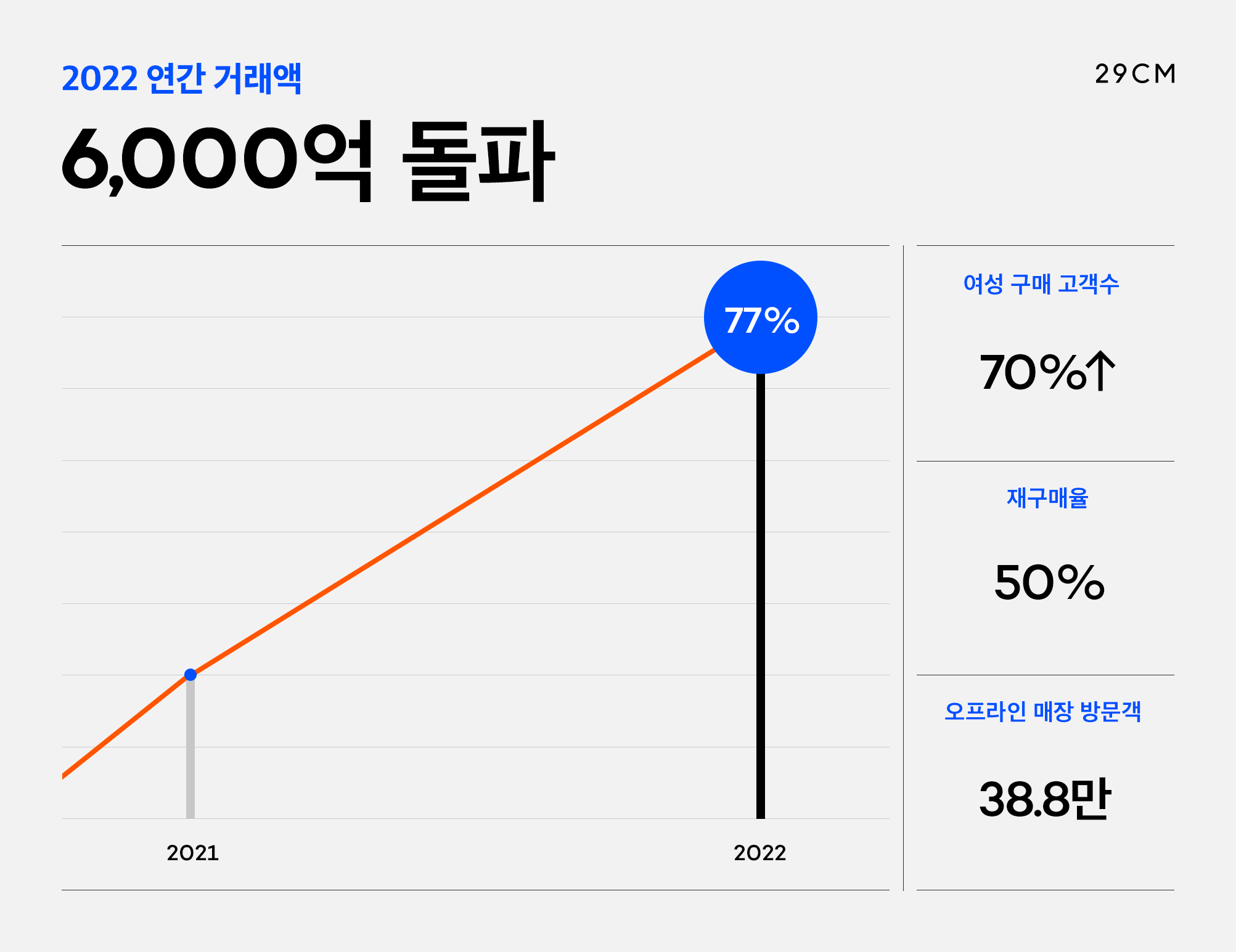 취향 셀렉트샵 29CM(이십구센티미터)의 2022년 연간 거래액이 전년 대비 80% 가까이 성장한 6천억 원을 넘어섰다. 상승세에는 브랜딩 강화와 신진 브랜드 영입 확대를 통한 여성 패션·잡화 부문의 ...